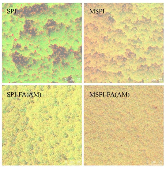 CLSM microscopy of emulsion gels induced by different modified soybean protein isolates.