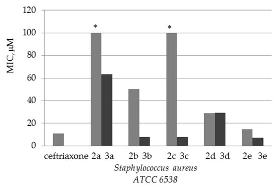 The most pronounced antibacterial activity was shown by the compounds 2e, 3b, 3c and 3e against the Gram-positive test strain of Staphylococcus aureus ATCC 6538. The antibacterial effect of these compounds against this test strain reached 7 μM, even better than that of ceftriaxone.
