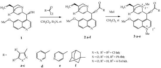 The method proposed by us is based on the reaction of quinine acylation with hydrochlorides of pyridine-3- and pyridine-4-carbonyl chlorides. It can compete with that stated in [14] due to higher yields (>80%) and the absence of the need for further purification of the products isolated from the reaction mixture. Esters 2a–f were obtained by acylation of quinine 1 with various acid chlorides in dichloromethane in the presence of triethylamine at room temperature in 86–91% yield (Scheme 1).