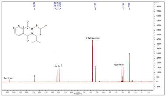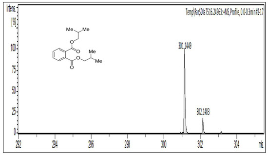 The structure of BDCe fraction was confirmed by NMR, HR-MS, and IR analysis. 1H-NMR (500 MHz, CDCl3, ppm): two aromatic signals at δH 7.71–7.73 ppm (m, 2H) and δH 7.52–7.54 ppm (m, 2H) indicated the presence of two sets of equivalent protons. In the aliphatic region, the doublet at 0.99 (d, 12H, J = 6.7 Hz) showed the four equivalent methyl groups attached to (CH) methine group. Another doublet present at δH 4.08 ppm (4H, J = 6.7 Hz) indicated two equivalent (CH2) methylene groups attached with a electronegative O atom of ester. The presence of multiplet at δH 2.01–2.06 (2H) indicates the presence of two equivalent methine groups (Figure 3).