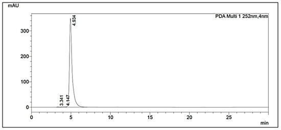 13C-NMR (125 MHz, CDCl3, ppm): in the aliphatic region, the peaks at δC 19.29, 27.87, and 71.93 can be assigned to carbon atoms a, b, and c, respectively. In the aromatic region, the carbon atoms at δC 128.98 and 131.04–132.54 belong to d and e-f, respectively, and the peak at 167.8 was assigned to the ester carbon atom (Figure 4). The peak at δC 167.6 ppm in the carbon spectrum showed the presence of carbonyl ester, which was further identified by the IR spectrum (Figure 5). The HR-MS spectrum of the BDCe fraction displayed the single peak at m/z 301.1449 (M + Na+) (calculated 301.1410), which indicated the molecular formula to be C16H22O4Na+ at 301.1449 (Figure 6). The UHPLC analysis of the BDCe fraction showed the presence of a single peak, which was 98% pure (Figure 7).