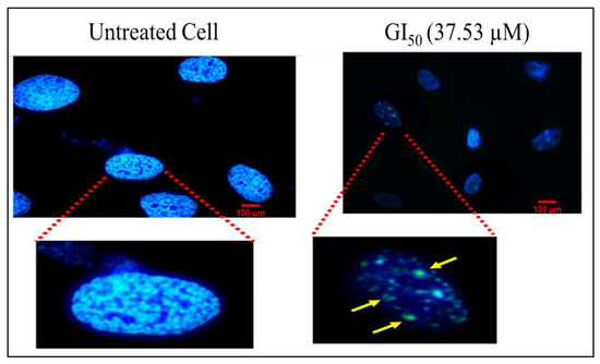 Hoechst 33,258 is a DNA-specific fluorescent dye that penetrates the cell and intercalates at A-T regions of DNA [26]. Typical apoptosis signs such as disintegration, shrinking, fragmented nuclei, and chromatin condensation in MG-63 cells after the treatment with BDCe fraction (37.53 µM) are seen in Figure 10. However, untreated cells showed non-apoptotic features, i.e., uniformly dispersed chromatin.
