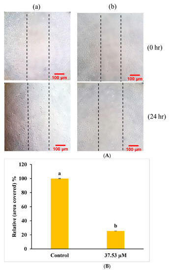 The loss of migration of cells revealed the induction of apoptosis via inflammatory reactions [25]. Cell-migration assays were used to check the potential of the BDCe fraction to inhibit MG-63 cells and migrated cells into the scratch area. Phase-contrast images highlighted that the BDCe fraction has potential to inhibit the migration of MG-63 cells towards the scratch area (Figure 10). In untreated control cells, nearly 100% of MG-63 cells migrated towards the scratched area after 24 h (Figure 11A(a)).