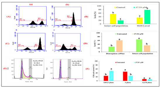 (A) The generation of intracellular ROS in MG-63 detected by DCFH-DA staining (M1 represents an intact cell population, and M2 represents cells with the accumulation of intracellular ROS). (B) Histogram showing the generation of intracellular ROS in MG-63 cells (24 h) exposed to BDCe fraction from O. bracteata. (C) The disruption of mitochondrial membrane potential (ΔΨm) in Mg-63 cells detected by staining with Rhodamine 123 (M1 represents cells with the disruption of ΔΨm and M2 represents the intact cells.). (D) Histogram showing disruption of mitochondrial membrane potential (ΔΨm) in MG-63 cells (24 h) exposed to BDCe fraction from O. bracteata. (E) The treatment of the BDCe fraction from O. bracteata (24 h) induced cell cycle arrest at the G0/G1 phase in MG-63 cells detected by a cell-cycle-analysis kit. (F) Histogram showing different phases of G0/G1, S, G2/M in MG-63 cells using a flow cytometer. (a) Untreated MG-63 cells, (b) MG-63 cells treated with BDCe fraction (37.53 µM) for 24 h. Data labels with different letters represent significant difference among them at (p ≤ 0.05).