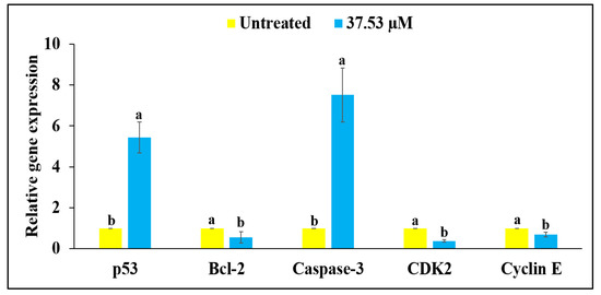 The RT-qPCR analysis of MG-63 cells with BDCe fraction (37.53 µM) displayed an enhancement of 5.43-fold and 7.51-fold in p53 and caspase-3 expression, respectively, but a decrease of 0.51-fold, 0.37-fold, and 0.69-fold in Bcl-2, CDK2 and Cyclin E, respectively, as compared to untreated MG-63 cells, as shown in Figure 14.