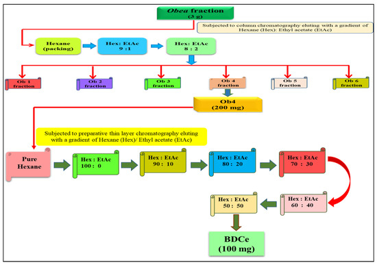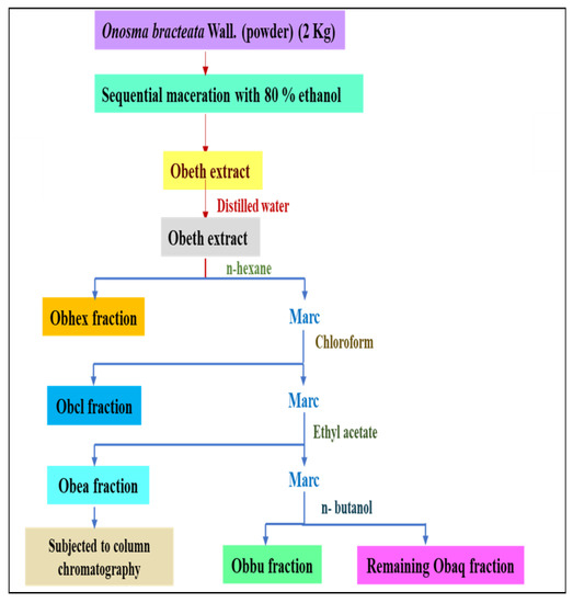 The plant material was washed with distilled water and kept at 40 °C. The dried plant was coarsely ground (2 kg) and soaked in ethanol (80%) using the maceration method. The supernatant was decanted off into a flask, and ethanol was distilled using a Rotavapor (Buchi Rotavapor R-210, Switzerland) to obtain ethanolic extract (Obeth). Further, fractionation was performed using different organic solvents with increasing polarity, viz., n-hexane to yield Obhex fraction (6 g), chloroform to yield Obcl fraction (10 g), ethyl acetate to yield Obea (7 g), n-butanol to yield Obbu (15 g), and the remaining extract to yield Obaq fraction (18 g) (Figure 17).