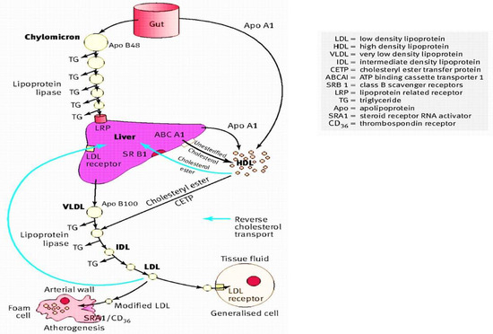 Hypercholesterolemia (HC) is related to an elevated level of plasma low-density lipoprotein-cholesterol (LDL-C), as plasma LDL is the chief carrier of cholesterol [33]. The gut absorbs dietary cholesterol primarily packed in chylomicrons(triglyceride-rich); these chylomicrons first break down with the help of lipoprotein lipase (LPL), then the fatty acids and monoglycerides released are further supplied to the adipose tissue and muscles. In contrast, the remnant of chylomicron passes through the liver (Figure 1). Then liver produces very-low-density lipoproteins (VLDL), from which they are exuded into the bloodstream.VLDL becomes enlarged due to the presence of triglycerides in it. As these triglycerides are unable to accommodate themselves in VLDL, instead they start to aggregate themselves in the liver resulting in the development of fatty liver disease.LPL metabolizes VLDL and produces intermediate-density lipoproteins (IDL). Later, it becomesconverted to LDL. The liver also produces high-density lipoprotein (HDL) particles from cholesterol, incorporating cholesteryl esters released from peripheral tissues. In this way, HDL becomesinvolved in the reverse transport of cholesterol from peripheral tissues to the liver. Cholesteryl ester-laden HDL particles are moved to LDLs via cholesteryl ester transfer protein (CETP). Then, these cholesteryl esters are carted via LDL particles, which are absorbed by the liver and peripheral tissues (to a lesser extent). The LDL uptakes, as well as degradation in the liver, rely on LDL particles’ binding onto cell surface receptors (LDL-receptors) of hepatocytes. These receptors are particularly connected to apolipoprotein B (apoB) on the LDL particle. Then, the LDL: LDL-receptor complex is internalized via endocytosis. The whole internalization process is reconciled through the LDL receptor adaptor protein. These receptor molecules becomerecycled, and the LDL particles undergo lysosomal degradation. A protein expressed in hepatocytes, the proprotein convertase subtilisin/kexin type 9 (PCSK9), is believed to play a vital role in the catabolism of LDL-receptors [34].