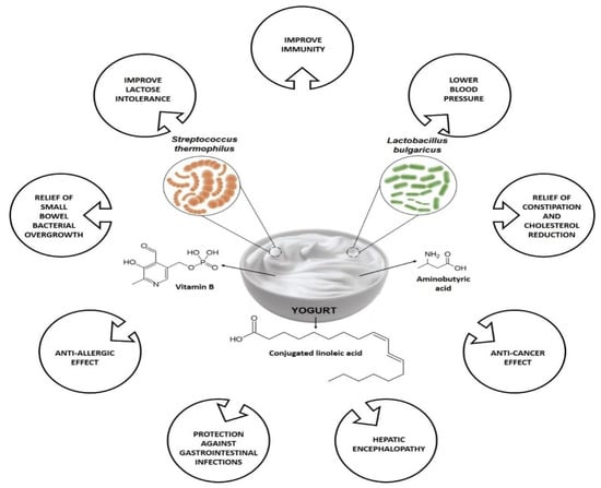 Indian Ayurveda dated back approx. 6000 BC, about the health-related benefits of having fermented milk-based items [69]. These days, around 700 different cheeses and yogurt items are consumed as part of Indian food. Yogurt was well known in the ROman and Greek empires, and the Greeks were the first to mention it in written references in 100 BC, noting the use of yogurt by barbarous nations [69]. In the book Bible, Abraham owed his long life and fecundity to consuming yogurt, as is referenced in the description of the “Land of Milk and Honey,” which several historians claim refers to yogurt [69]. Figure 2 summarizes some of the health benefits associated with yogurt consumption. Both yogurts’ bacterial and non-bacterial components are believed to play health-promoting effects in human health, specifically on the host’s immune system. Among other constituents, bioactive peptides, conjugated linoleic acid (CLA), group B vitamins, c-aminobutyric acid are a few metabolites are found in yogurt, and where the dairy products matrix, bioactive metabolites (i.e., exopolysaccharides and peptides) secreted throughout fermentation along with the active enzymes, fermentation process, are responsible for the health benefits of yogurt [71,72]. Based on fat content, the three most important types of yogurts currently available are low-fat, regular, and non-fat yogurts. Low-fat yogurts are made from partially skim or low-fat milk, whereas regular yogurt is formed from full-fat milk. Skim milk is also used for non-fat yogurt [73]. The nutritional composition of yogurt is shown in Table 2.