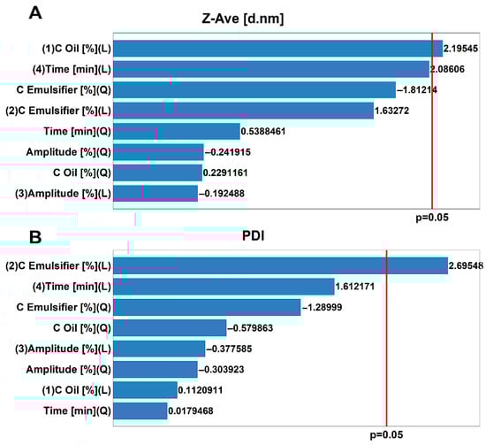 Pareto charts for the influence of input parameters (oil concentration, emulsifier concentration amplitude, sonification time) on (A) average droplet size of nanoemulsions (d. nm), (B) polydispersity Index (PDI).
