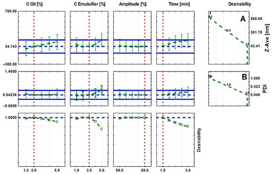 Approximation profiles for the influence of input parameters on (A) an average droplet size (nm) of nanoemulsions (nm), (B) polydispersity index (PDI).