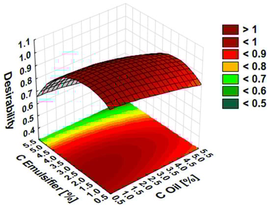 Saddle plots for desirability for essential oil and emulsifier concentration.