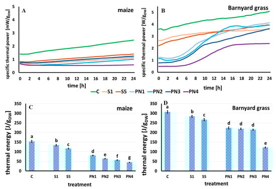 In the water-treated (control) seedlings of maize (Figure 5A) and barnyard grass (Figure 5B), the obtained specific thermal power curves increased linearly during the measurement for 24 h, reaching the values of 2.45 mW·gDW−1 for maize and 5.09 mW·gDW−1 for barnyard grass.