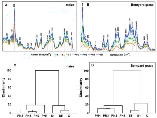 FT-Raman spectra show the chemical composition of seedling’s endosperm of maize (A) and barnyard grass (B) that were growing on the surfactants (S1, light orange line, and S5, dark orange line), nanoemulsions with peppermint oil (PN1, light blue line; PN2, cyan line; PN3, dark blue line; PN4, violet line) and water (C, green line). The mean values were based on six repetitions. Hierarchical cluster analysis of the FT-Raman spectra of the maize (C) and barnyard grass (D). Surfactants S1 (1% v/v) and S5 (10% v/v), nanoemulsions with peppermint oil PN1 (1% v/v), PN2 (1.5% v/v), PN3 (2% v/v), PN4 (5% v/v), and water (C—control).