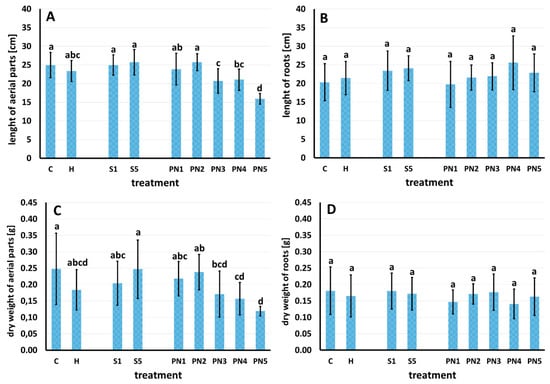 Length of aerial parts (A), length of roots (B), dry weight of aerial parts (C), and dry weight of roots (D) of maize seven days after spraying with water—C, herbicide—H, surfactants—S1 (1% v/v) and S5 (10% v/v), and nanoemulsions with peppermint oil PN1 (1% v/v), PN2 (1.5% v/v), PN3 (2% v/v), PN4 (5% v/v), and PN5 (10% v/v). Bars represent mean value ± SD. The letters a–d indicate statistically significant differences. Values indicated by the same letters did not differ significantly at p ≤ 0.05 according to Duncan’s test (within the tested species), n = 4.