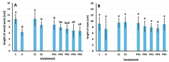 Length of aerial parts (A) and length of roots (B) of barnyard grass seven days after spraying with water—C, herbicide—H, surfactants—S1 (1% v/v) and S5 (10% v/v), and nanoemulsions with peppermint oil PN1 (1%v/v), PN2 (1.5% v/v), PN3 (2% v/v), PN4 (5% v/v), and PN5 (10% v/v). Bars represent mean value ± SD. The letters a–d indicate statistically significant differences. Values indicated by the same letters did not differ significantly at p ≤ 0.05 according to Duncan’s test (within the tested species), n = 4.