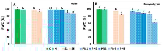 Relative water content (RWC) of maize (A) and barnyard grass (B) that were growing on the surfactants S1 (1% v/v) and S5 (10% v/v), nanoemulsions with peppermint oil PN1 (1% v/v), PN2 (1.5% v/v), PN3 (2% v/v), PN4 (5% v/v), and PN5 (10% v/v), herbicide (H) and water (C) calculated as (fresh mass—dry mass)/(turgid mass—dry mass)] × 100. The letters a–f indicate statistically significant differences. Values indicated by the same letters did not differ significantly at p ≤ 0.05 according to Duncan’s test (within the tested species), n = 10.