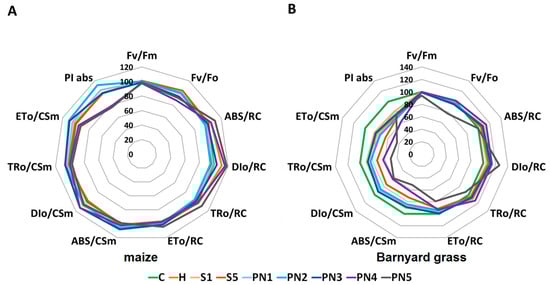 Values of selected Chl a fluorescence parameters of maize (A) and barnyard grass (B). C—water control, H—herbicide, surfactants S1 (1% v/v) and S5 (10% v/v), nanoemulsions with peppermint oil PN1 (1% v/v), PN2 (1.5% v/v), PN3 (2% v/v), PN4 (5% v/v), and PN5 (10% v/v).