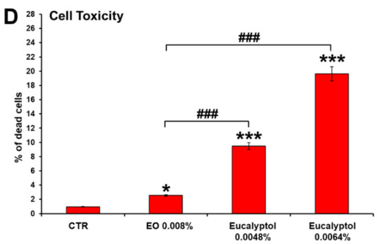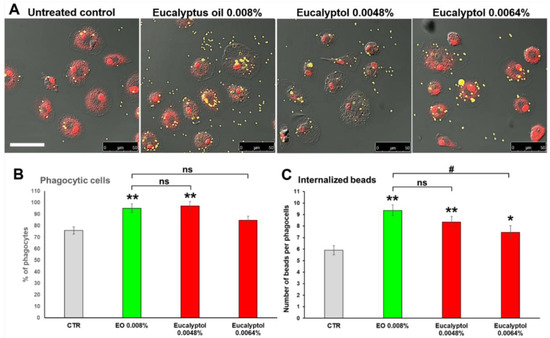 (1) For the comparative analysis of the efficacy of EO vs. eucalyptol, by adding 2 × 107 beads/mL of yellow-green fluorescent polystyrene beads to the cultures (∅ 1 μm, at a ratio of at least 10 beads/cell; Molecular Probes) as previously described [23]. Samples were analyzed after 30 min challenge.