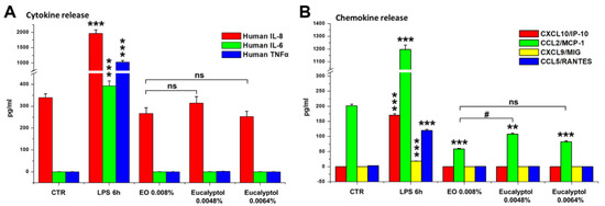Effect of Eucalyptus oil and 1,8-cineole (eucalyptol) treatments on pro-inflammatory cytokines (A) and chemokines (B). Analysis by cytometric bead array of the human cytokines IL-8, IL-6, IL-10, and TNF-α (A), and chemokines CXCL10/IP10, CCL2/MCP-1, CXCL9/MIG, and CCL5/RANTES (B) released in culture medium by the untreated control (CTR); MDMs stimulated for 6 h with LPS and cells treated for 24 h with 0.008% EO, 0.0048% or 0.0064% eucalyptol. Significance (One-way ANOVA + Tukey multiple comparison test), * vs. CTR: ** p < 0.01, *** p < 0.001; # vs. EO: # p < 0.05; ns: not significant.