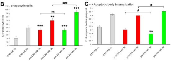 The ability of essential oil to improve the MDMs’ phagocytic ability not only against non-specific foreign bodies (fluorescent beads) or microorganisms (yeasts or bacteria) but also towards apoptotic cells has also been assessed. To this purpose, apoptotic bodies (AB) obtained from the MCF7 human breast cancer cells by staurosporine treatment, as described in Materials and Methods, were stained with propidium iodide (PI), administered to EO pre-treated MDMs and untreated controls and analyzed after 1 h and 3 h (Figure 4). MDMs pre-treated for 6 h with 0.1 µg/mL LPS were used as a positive control of macrophage activation. Confocal microscopic observation (Figure 4A) and quantitative evaluation of the percentage of phagocytes (Figure 4B) as well as of the number of internalized AB/cells (Figure 4C) at the defined times showed that EO pre-treatment can stimulate the internalization of AB. Indeed, already 1 h after AB administration, the percentage of phagocyting macrophages under EO treatment was 2.2-fold higher compared to the untreated control at the same time, and this increase was maintained at 3 h when both the percentages of phagocytes and the number of AB/cells were also significantly higher than those recorded in LPS-treated MDMs (Figure 4B,C).