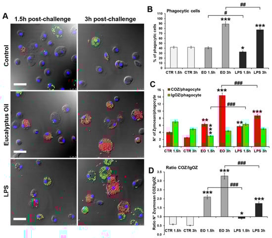 To determine if EO promotes complement receptor (CR)- or IgG receptor (FcR)-mediated phagocytosis, a phagocytosis assay was performed that uses fluorescent complement-opsonized (COZ) and IgG-opsonized (IgOZ) zymosan particles, respectively. For this assay, Alexa Fluor 488-IgOZ (green hue) and Alexa Fluor 594-COZ (red hue) were simultaneously added at a ratio of 20 yeast/cell and with a COZ/IgOZ ratio of 1:1 to the MDM cultures pre-treated 24 h with 0.008% EO or 6 h with 0.1 μg/mL LPS, the latter used as a positive control of macrophage activation. Samples were analyzed 1.5 h and 3 h after the addition of zymosan particles to the cultures. As shown in Figure 5, in the untreated control, IgOZ particles were preferentially internalized at both times analyzed, with a ratio COZ(n)/IgOZ(n) ≅ 0.5 (Figure 5D). 1 h post-challenge, LPS treatment promoted the internalization of both COZ and IgOZ particles [ratio of COZ(n)/IgOZ(n) ≅ 1], while COZ particles were preferentially phagocytosed 3 h post-challenge [ratio COZ(n)/IgOZ(n) ≅ 1.7]. Conversely, in EO-treated cultures, COZ particles were internalized at a number which was 2.1- and 3.3-fold higher than the IgOZ particles after 1.5 h and 3 h, respectively (Figure 5D), indicating that the essential oil mainly acts by promoting the CR-mediated phagocytosis. Furthermore, 3 h post-challenge, the number of COZ particles/phagocytes was significantly (p = 0.001) higher in EO-treated MDMs compared with LPS-treated cultures analyzed at the same time (Figure 5C).