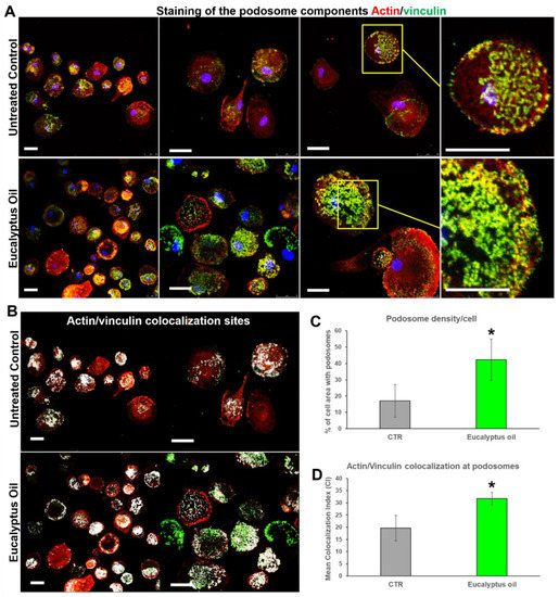 To assess whether EO affects podosome formation, the association of the actin-binding protein vinculin with the actin-rich dot-shaped contacts at the cell adhesion sites was firstly analyzed. Confocal microscopic analysis showed that in EO-treated MDMs actin/vinculin double-stained podosome structures were highly increased compared with the untreated control (Figure 6A). This was confirmed by the quantitative analysis that recorded a significant increment in podosome density per cell in the EO-treated vs. the untreated cultures (2.5-fold vs. control; p < 0.05) (Figure 6C). Further, in macrophages treated with the essential oil, the colocalization index (CI) of the actin cores and vinculin-rich rings (yellow hue in Figure 6 A and white hue in Figure 6B) increased 1.6-fold compared to the untreated control (Figure 6D; p < 0.05).