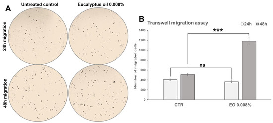 To assess whether EO affects the migratory ability of macrophages in response to a chemotactic stimulus, a Transwell migration assay, in the absence or in the presence of 0.008% EO, was performed as described in Materials and Methods. MCSF-1 (40 ng/mL) was used as a chemoattractant. As reported in Figure 8, after 48 h from seeding, the number of EO-stimulated cells recovered at the bottom of the inserts was significantly (p < 0.001) higher compared to the untreated control (2.3-fold vs. control), indicating that EO treatment had increased macrophage migration through the porous membrane insert. No significant (p = 0.1556) differences were recorded after 24 h from seeding (Figure 8).