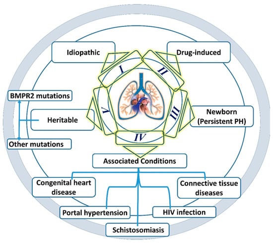 A cluster of clinical symptoms marked by persistent vasoconstriction of small pulmonary arteries and increased impendence in pulmonary circulation. An active manifestation of PAH triggers a series of events via the occlusion of the pulmonary vessel and augmented the vascular remodeling of pulmonary arterioles, which eventually leads to mPAP exceeding 25 mmHg at rest. Principally, PAH is grouped into I to V classes subject to associated comorbidities [2,12]. The detailed graphical representation of PAH classes is shown in Figure 1. Hemodynamically, 15 mmHg pre-capillary pressure, i.e., pulmonary artery wedge pressure and more than 3 Wood units of pulmonary vascular resistance (PVR) confer the foundation of PAH. The hemodynamic of high pressure provokes endothelial dysfunction and injury to pulmonary vasculature [13].