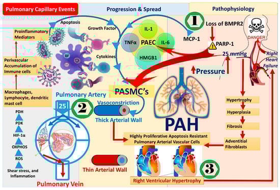 The above course of events is attributed to the appearance of PA vascular cells that are resistant to apoptosis and are extremely proliferating. This constitutes an impairment of adventitial fibroblasts, PA smooth muscle cells (PASMCs), and PAECs. As a consequence of vasoconstriction at the pulmonary artery and the progression of disease, the arterial wall becomes thick. In addition, left-to-right switching of congenital heart defects results from an increased afterload of RV and can lead to hyperkinetic PAH followed by heart failure and premature death [14,15,16,17,18,19,20]. Furthermore, genetic damage to bone morphogenetic protein receptor (BMPR2) signaling or hypoxia [21,22] in PAEC dysfunction may provoke DNA damage. In addition, MCP-1 (monocyte/macrophage chemoattractant protein-1), a powerful chemokine and mononuclear cell activator, may have a role in the early onset and/or development of pulmonary hypertension (PH). The overexpression of Poly (ADP)-ribose-1 (PARP-1), a component/marker of the DNA repair/damage, designates pulmonary artery smooth muscle cells (PAH-PASMCs) in pulmonary hypertension [23]. The intensified proliferation of PAH-PASMCs results in the generation of reactive oxygen species (ROS) is caused by mitochondrial dysfunction. ROS further exacerbates angiogenesis marked by intracellular Ca2+ influx and the subsequent remodeling of the pulmonary vasculature [13,24,25,26,27]. These metabolic transformations promote oxidative phosphorylation (OXPHOS) and glycolysis [28]. At the transcriptional level, the arousal of the transcription factor, Hypoxia-inducible factor 1-alpha (HIF-1α), declines pyruvate metabolism via the augmentation of pyruvate dehydrogenase kinase (PDK) expression and the deactivation of the pyruvate dehydrogenase (PDH). All these molecular events induce increased spread and endurance of PAH cells. Furthermore, alterations in mitochondrial protein profiles, mitochondrial shape, and plug of Heat Shock Protein-90 accumulated in the mitochondria of PAH-PASMCs; they grant PAH cell survival [22].