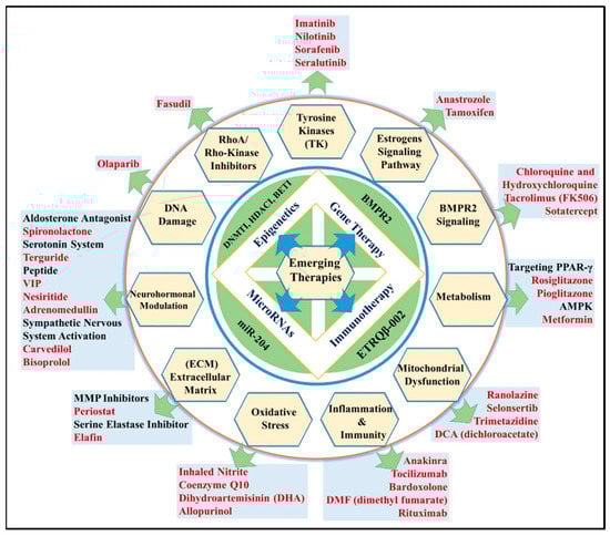 Molecules and pharmacological targets implicated in PAH (black fonts represent category of drugs; red fonts represent drug).