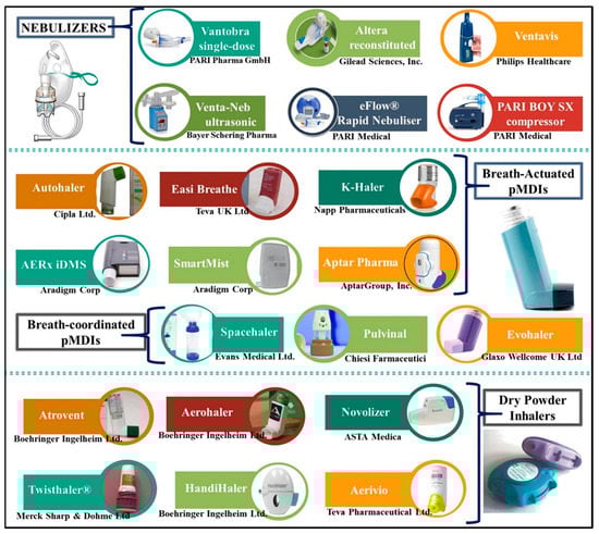 Representative example of devices (brand names) for inhalation drug delivery.