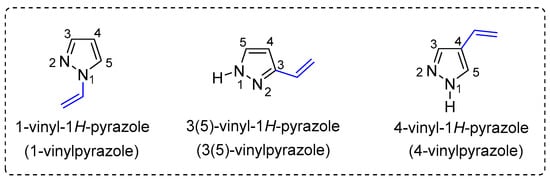 Structures of 1-vinylpyrazole, 3(5)-vinylpyrazoles, and 4-vinylpyrazole. For sake of simplicity, throughout the manuscript, the nomenclature 1-vinylpyrazole is adopted instead of 1-vinyl-1H-pyrazole.