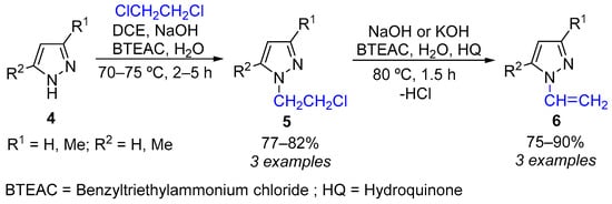 Another interesting method that allowed the formation of 1-vinylpyrazoles used water as solvent under phase transfer catalysis conditions (PTC). This method involved the N-alkylation of pyrazole 4 with dichloroethane (DCE) followed by dehydrochlorination of the obtained 1-(2-chloroethyl)pyrazoles 5, which proceeded smoothly in water under PTC conditions to the formation of 1-vinylpyrazoles 6 in 75–90% yield (Scheme 2) [40].