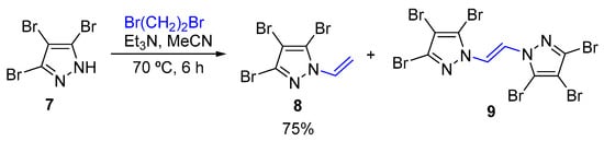 The reaction of 3,4,5-tribromopyrazole 7 with 1,2-dibromoethane and triethylamine followed by the elimination of HBr gave 3,4,5-tribromo-1-vinylpyrazole 8 in 75% overall yield (Scheme 3) [41]. The formation of 1,2-bis(3,4,5-tribromopyrazol-1-yl)ethane 9 by substitution of both bromine atoms of 1,2-dibromoethane could be suppressed by performing the reaction in acetonitrile using a large excess of triethylamine.