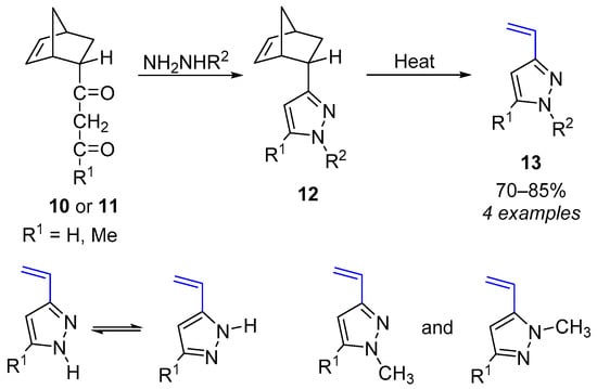 Only a few examples of the synthesis of 3- and 5-vinylpyrazoles are known, especially when one of the nitrogens bears a proton. In 1976, Sharp reported the synthesis of 3-vinylpyrazoles by thermolysis and rearrangement of 3H-1,2-diazepines [42]. Later, Ponticello demonstrated that the cracking of the adducts 12, prepared by a condensation–cyclization reaction of a β-ketoaldehyde 10 (R1 = H) or a β-diketone 11 (R1 = Me) with hydrazine or its derivatives, afforded 3(5)-vinylpyrazoles 13 in good yield (Scheme 4) [43]. When R1 = H, the two tautomers corresponding to the 3- and 5-vinylpyrazoles are indistinguishable, since very easy interconversion might be expected through ions formed by addition and loss of a proton. As expected, condensation of methyl hydrazine with β-ketoaldehyde or β-diketone each gave two isomeric pyrazoles. Substitution on nitrogen prevents tautomerism; thus, the two isomers were not identical.