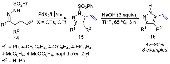Furthermore, 5-vinylpyrazoles 16 could be obtained by aromatization of 5-vinylpyrazolines 15 generated from N-sulfonyl,C-homoallyl-hydrazones 14 via Pd-catalyzed C-H oxidative C,N-cyclization through a 5-exo-trig process from a π–allyl complex intermediate when the Pd(II) center is associated to noncoordinating anions such as tosylates or triflates. Indeed, 5-vinylpyrazolines with electron-active substituents at the p-position of the phenyl ring and hindered pyrazolines could be converted to the corresponding pyrazoles in moderate-to-high yields through a base-induced eliminative aromatization process (Scheme 5) [44].