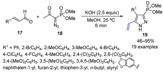 Mohanan and coworkers developed a rapid synthesis of 5(3)-vinylpyrazoles under mild conditions. The reaction was based on the versatility and dual reactivity of Bestmann–Ohira reagent (BOR) 18 as a homologation reagent and cycloaddition reactant in a domino reaction with a cinnamaldehyde 17 (Scheme 6) [45]. The sequence involved a formal 1,3-dipolar cycloaddition/Horner–Wadsworth–Emmons (HWE) homologation of the resulting pyrazoline carbaldehydes followed by a 1,3-H shift to give the 5(3)-vinylpyrazoles.