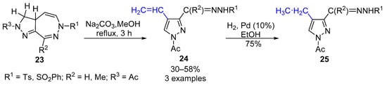 Synthesis of 4-vinylpyrazoles 24 from tetrahydropyrazolo[3,4-d][1,2]diazepines 23 [49].