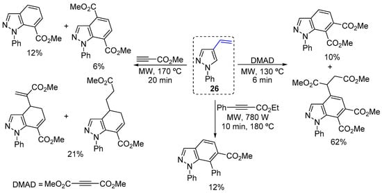Diels–Alder (DA) cycloadditions are amongst the most elegant reactions for rapidly building complex cyclic compounds. Vinylpyrazoles are very reluctant to react as dienes in DA cycloadditions because of the loss of aromaticity of the pyrazole ring on [4 + 2] cycloadduct formation being much less reactive than vinylpyrroles and vinylindoles. Harsh reaction conditions are required, such as sealed vessels and high pressures (8–10 atm) and temperatures (120–140 °C) for long reaction times (several days), to obtain very low or moderate yields [50,51]. So far, the vinylpyrazoles have been used as dienes in Diels–Alder reactions for the preparation of compounds with medicinal interest, being these ones of the most described reactions of vinylpyrazoles in literature. In 1996, Díaz-Ortiz et al. studied the effect of microwaves in solvent-free conditions in the improvement of the reactivity of vinylpyrazoles. They found that 4-vinylpyrazoles 26 reacted with dienophiles, such as methyl and ethyl propiolate, dimethyl acetylenedicarboxylate, N-phenylmaleimide, or tetracyanoethene, to form 1:1 adducts [52]. The cycloaddition occurred rapidly (6–30 min), and the yields, while generally fair, were superior to those of conventional methods. Moreover, with microwave activation, it was possible to use low-reactive dienophiles such as ethyl phenylpropiolate, and other intermediate products not observed in conventional methods were isolated and characterized. This type of reaction also occurred with 3- and 5-vinylpyrazoles [53]. Since DA reactions of vinylpyrazoles have been the subject of several publications, only some examples are provided for the reaction of 4- and 5-vinylpyrazoles 26 and 27 with some common dienophiles (Scheme 10 and Scheme 11) [53].