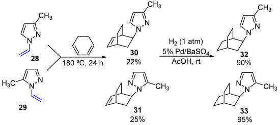 Few data on the reactivity of 3- and 5-methyl-1-vinylpyrazoles 28 and 29 as dienophiles are available in the literature. Asratyan and coworkers studied the behavior of these pyrazoles as dienophiles in the reaction with cyclohexa-1,3-diene (Scheme 12) [55]. Although 1H- and 13C-NMR data showed that 5-methyl-1-vinylpyrazole 29 existed mainly as the S-cis-N2 isomer, while 3-methyl-1-vinylpyrazole 28 was a roughly equimolar mixture of steric isomers [28], no characteristic differences were found in the behavior of these compounds in the cycloaddition. The reaction with the diene proceeded only at 180 °C to give the product in low yields. When reaction temperature is increased to 220 °C, fast polymerization of the diene and dienophile occurred. The authors suggested that the spatial location of the vinyl group in 1-vinylpyrazoles 28 and 29 with respect to N-2 took no part in the Diels–Alder reaction. The obtained products 30 and 31 went through a hydrogenation reaction to afford compounds 32 and 33.