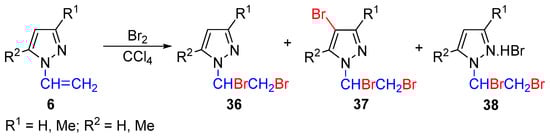 Compared with 1-vinylimidazoles and 1-vinyltriazoles, 1-vinylpyrazoles show a different behavior in bromination reactions [58]. With 1-vinylimidazoles, the formation of a complex with the halogen occurs, while with 1-vinyltriazoles, addition of bromine to the double bond of the vinyl group occurs. Notably, 1-vinylpyrazoles 6 do not form complexes with bromine. The bromination in carbon tetrachloride at −20 °C affords a complex mixture of products that is difficult to separate. The main reaction products are 1-(1’,2’-dibromo)ethylpyrazoles 36 and the product of electrophilic substitution at C-4 37; however, the coordination of the released hydrogen bromide with the pyrazoles present in the reaction mixture also produces hydrohalides 38 (Scheme 14). Higher percentages of 36 can be obtained by increasing the temperature, by adding the vinylpyrazole to a solution of bromine, and by using an excess of bromine, but the stability of the bromination products depends on the position and number of substituents in the pyrazole ring, especially methyl groups.