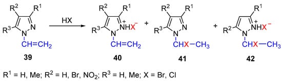 The products of the hydrohalogenation of vinylpyrazoles depend on the structure of the pyrazole itself and the nature of the hydrogen halide. Skvortsova and coworkers investigated the hydrohalogenation of a series of vinylpyrazoles 39, (l-vinylpyrazole, 4-bromo-l-vinylpyrazole, 3-methyl-l-vinylpyrazole, 5-methyl-l-vinylpyrazole, 3,5-dimethyl-l-vinylpyrazole, and 4-nitro-3,5-dimethyl-l-vinylpyrazole) (Scheme 15) [59]. At −150 °C, addition of hydrogen halides to all l-vinylpyrazoles occurred only at the N-2 with formation of salts 40. However, the hydrohalides of the less basic vinylpyrazoles (l-vinylpyrazole, 4-bromo-l-vinylpyrazole, and 4-nitro-3,5-dimethyl-l-vinylpyrazole) decomposed rapidly. On the other hand, at 20–25 °C, l-vinylpyrazole and 4-bromo-l-vinylpyrazole added predominantly hydrogen halides at the double bond of the vinyl group, with formation of l-(l′-haloethyl)pyrazoles 41, which was in accordance with Markovnikov’s rule. Then, the resulting compounds 41 underwent further hydrohalogenation at the N-2 to give compounds 42. Under these conditions, the more basic alkyl-substituted l-vinylpyrazoles produced the corresponding hydrohalides. Addition of hydrogen halides to the double bond of the vinyl group of 4-nitro-3,5-dimethyl-l-vinylpyrazole was more difficult, since the nitro group decreased the nucleophilicity not only of the N-2 but of the double bond of the vinyl group. The reaction of 4-bromo-l-vinylpyrazole with HBr formed a mixture of products, whereas the reaction with HCl proceeded most specifically [59].