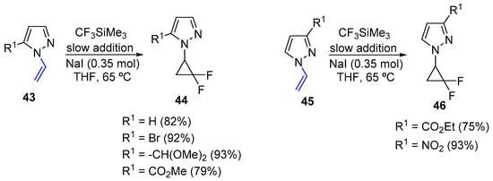Fluorinated cyclopropanes have become extraordinary structural motifs with huge importance in organic synthesis, drug discovery, and agrochemistry. In fact, highly potent compounds bearing a gem-difluorocyclopropyl group were disclosed in recent patents [60,61,62,63]. In most of the compounds reported in the literature, the gem-difluorocyclopropyl is attached to a carbon atom, while the corresponding N-linked analogues are less common. N-vinylpyrazoles 43 and 45 undergo difluorocyclopropanation with CF3SiMe3-NaI system with formation of the corresponding N-difluorocyclopropyl derivatives 44 and 46 in very good yield (Scheme 16). These compounds are stable and undergo further regioselective functionalization to afford gem-difluorocyclopropylpyrazole amines, carboxylic acids, aldehydes, bromides, and boronic derivatives [64]. It is noteworthy that this method is not successful for the preparation of other azole derivatives, such as imidazoles, triazoles, and tetrazoles, possibly because of the presence of a nucleophilic nitrogen atom (in the case of the imidazole) or electronic effects for the other representatives.