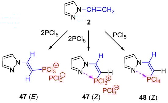 The phosphorylation of 1-vinylpyrazole 2 with phosphorus pentachloride afforded phosphorylated azoles 47 and 48 (Scheme 17) [65]. Krivdin and coworkers studied the effects of intramolecular and intermolecular coordination on 31P nuclear shielding both experimentally and theoretically, with a special emphasis on the calculation of 31P shielding constants. They noticed dramatic 31P nuclear shielding to approximately 150 ppm on changing the phosphorus coordination number by one (+(90–120) ppm for tetracoordinated phosphorus, −(20–40) ppm for pentacoordinated phosphorus, and −(200–220) ppm for hexacoordinated phosphorus) and suggested that 31P-NMR chemical shifts could serve as an unambiguous criterion of intra- or intermolecular coordination involving phosphorus.