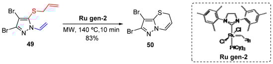 The N-vinylated pyrazoles are also useful intermediates for Grubbs’ ring closure metathesis reaction (RCM) to generate novel heterocycles [41,66]. For example, 5H-pyrazolo[5,1-b][1,3]thiazine 50 was obtained in 83% yield, in a short reaction time, by microwave irradiation of 1-vinylpyrazole 49 with Grubbs’ second-generation catalyst (Ru gen-2) (Scheme 18) [41,67], which in this reaction was more reactive than Grubbs’ first generation [68,69] and the Hoveyda–Grubbs’ catalyst [70].