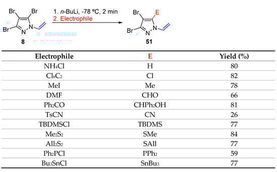 The vinyl group is a stable and versatile N-protection group for bromine–lithium exchange reactions in pyrazoles that can be removed easily under mild conditions. Begtrup and coworkers demonstrated that 3,4,5-tribromo-1-vinylpyrazole 8, underwent regioselective bromine–lithium exchange at the 5-position. Subsequent addition of an electrophile gave 5-substituted 3,4-dibromo-1-vinylpyrazoles 51 (Scheme 19) [41]. A range of electrophiles can be introduced at the 5-position. Longer lithiation time (10–15 min) led to lower yields of the 5-substituted product because of the low stability of the pyrazole anion.