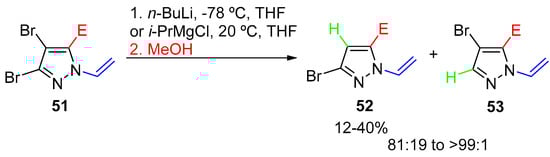 The 5-substituted 3,4-dibromo-1-vinylpyrazoles 51 can undergo subsequent bromine–lithium or bromine–magnesium exchange using n-BuLi or i-PrMgCl together with protons from methanol as the electrophile, affording compounds 52 and 53. The reaction occurred preferentially at C-4, with the regioselectivity between C-3- and C-4 being influenced by the nature of the metal and the 5-substituent (Scheme 20) [41]. Begtrup and coworkers found that bromine–lithium exchange took place with higher regioselectivity than bromine–magnesium exchange.