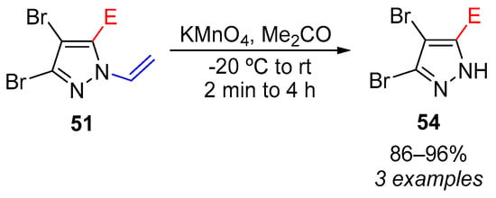 The vinyl group can be removed from the 5-substituted compounds 51 by mild treatment with KMnO4, affording the corresponding NH-pyrazoles 54. Depending on the substituents, slightly different conditions may be required (Scheme 21) [41]. For example, the vinyl group of 3,4,5-tribromo-1-vinylpyrazole (E = Br) and 3,4-dibromo-5-methyl-1-vinylpyrazole (E = Me) could be removed smoothly in excellent yield (96% for both) by treatment with a 2% solution of KMnO4 at room temperature and at 10 °C. When oxidation sensitive groups such as SMe (E = SMe) are present, the devinylation should be performed at −20 to −10 °C to avoid concurrent oxidation of SMe to SO2Me.