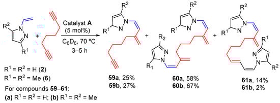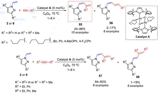 Among the transition-metal-catalyzed reactions, C-C bond formation via C-H activation has gaining increasing interest as a very powerful, selective, and atom-economical tool in organic synthesis [71]. Aromatic protons have been commonly involved in this process, but functionalization of the vinyl C-H bond is more challenging because of competitive polymerization or Michael addition reactions, and electron-rich olefins are much less reactive [72]. The 1-vinylpyrazoles 2 and 6 underwent coupling with alkynes via C-H activation to afford Markovnikov-selective butadienylpyrazole derivatives 55 and 57 under mild conditions [73]. This reaction was efficiently catalyzed by the rhodium(I)-N-heterocyclic carbene catalyst A (A = [Rh(μ-Cl) (IPr) (η2-coe)]2) (Rh-NHC). The reaction occurred both with terminal or internal alkynes (Scheme 22) and with terminal diynes (Scheme 23) in mild conditions. With terminal diynes, a mixture of monohydrovinylated Z/gem product 59 and the doubly coupled derivatives bis-Z/gem 60 and Z/gem Z/E 61 was obtained (Scheme 23). The presence of the carbene ligand in the rhodium catalyst was found to be essential for the catalytic coupling and C-H activation of the electron-rich pyrazolyl olefin. Moreover, 1-vinylpyrazole 2 (R1 = R2 = H) was more reactive than 3,5-dimethyl-1-vinylpyrazole 6 (R1 = R2 = Me), but the reaction with the former presented slightly lower selectivity. It is worth mentioning that even with the diynes, the selectivity trend towards Markovnikov addition products was maintained, with disubstituted pyrazole 6 being slightly more selective than 2. Contrarily to aromatic alkynes, aliphatic terminal alkynes were preferentially hydrovinylated without dimerization, cyclotrimerization, or polymerization of the alkyne.