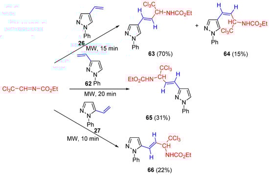 The reaction of vinylpyrazoles 26, 62, and 27 with N-trichloroethylidenecarbamate, which participates in cycloaddition reactions as a dienophile, as a dipolarophile, and even as a heterodiene, did not afford any cycloaddition product. Under microwave heating, the result of the reaction was found to depend on the nature of the diene and the substitution of the pyrazole ring. In fact, an electrophilic substitution reaction occurred through the exocyclic double bond, which was activated by conjugation with the pyrazole ring, to give Michael addition to the conjugated imine system (Scheme 25) [74]. Even in the 3- and 5-substituted pyrazoles 62 and 27, the reaction occurred at the double bond and not in the activated C-4 of the pyrazole ring. A mixture of trans-63 and cis-64 isomers was otained with pyrazole 26 (although the cis was obtained in 15% yield), while the thermodynamic trans isomer 65 and 66 was the only product observed in the reactions of pyrazoles 62 and 27, respectively. Under conventional heating in an oil bath, no reaction occurred under similar conditions of temperature and time, and the starting vinylpyrazoles were not recovered because of dimerization in these conditions.